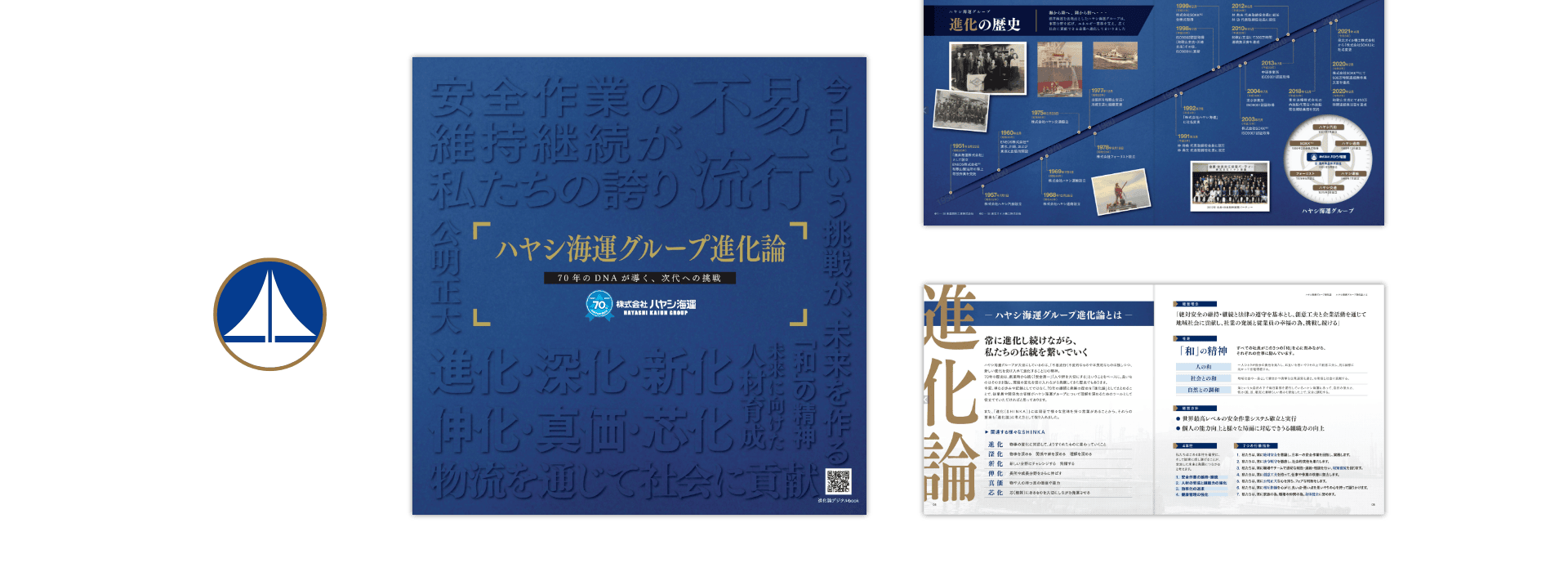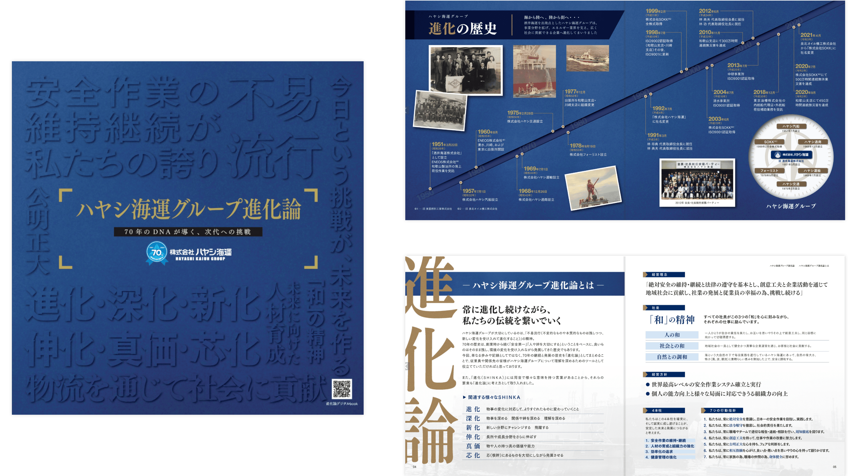 ハヤシ海運様の創立70周年にあわせて、周年記念誌「ハヤシ海運グループ進化論」を作成しました。単なる歩みや記録としてではなく、70年の継続と発展の歴史を「進化論」としてまとめることで、企業への理解を深めるためのツールとなるよう心がけました。 企画・構成案作成~取材・ライティング~撮影サポート~デザイン~印刷まで一貫して担当。