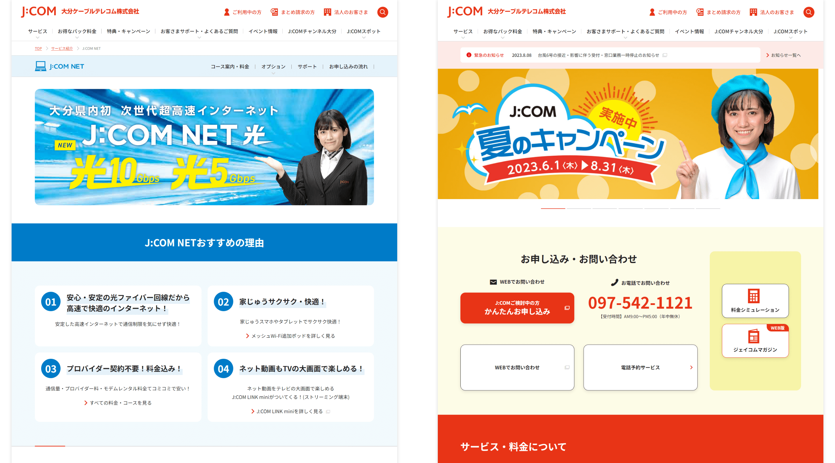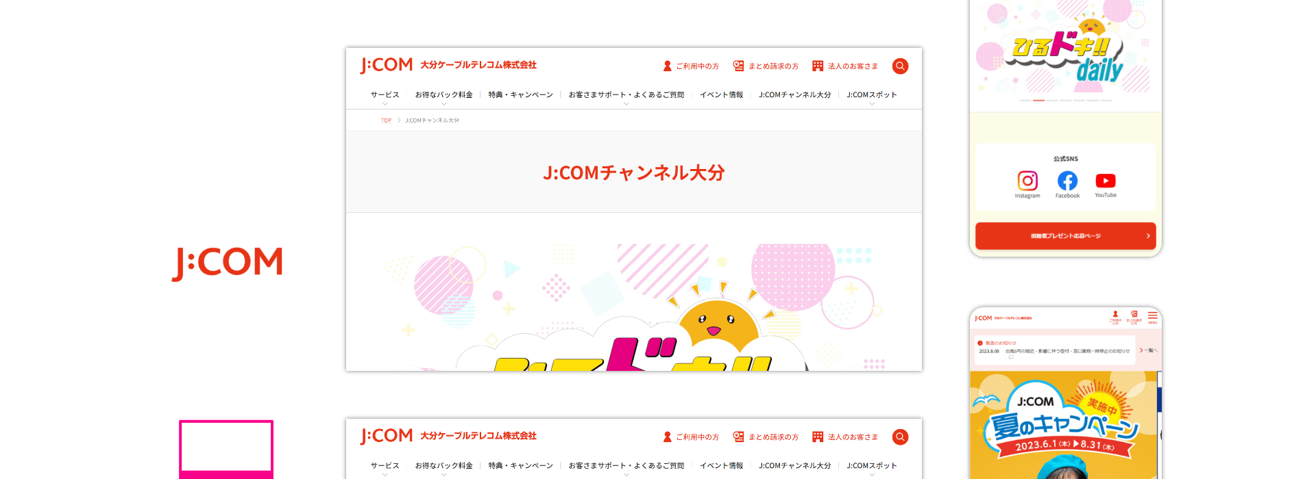 ケーブルテレビ(CS、BS、地デジ)やインターネット、格安スマホ、電話、電気、など、多彩なサービスを提供するJ:COM 大分ケーブルテレコム株式会社様のサイトリニューアルを担当しました。B to Cサイトということで特にスマートフォン向けのデザインはスマートフォンユーザーのユーザービリティを考慮し、スマホアプリライクな操作性を意識したインターフェースデザインを採用しました。